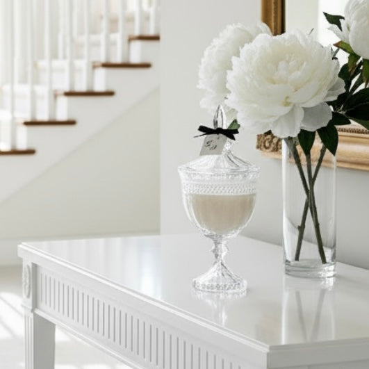 Turn everyday ambiance into a luxurious ritual with our Empress Candle. This beautifully cut glass vessel combines vintage charm and modern elegance — perfect for elevating your home décor or gifting with style.
