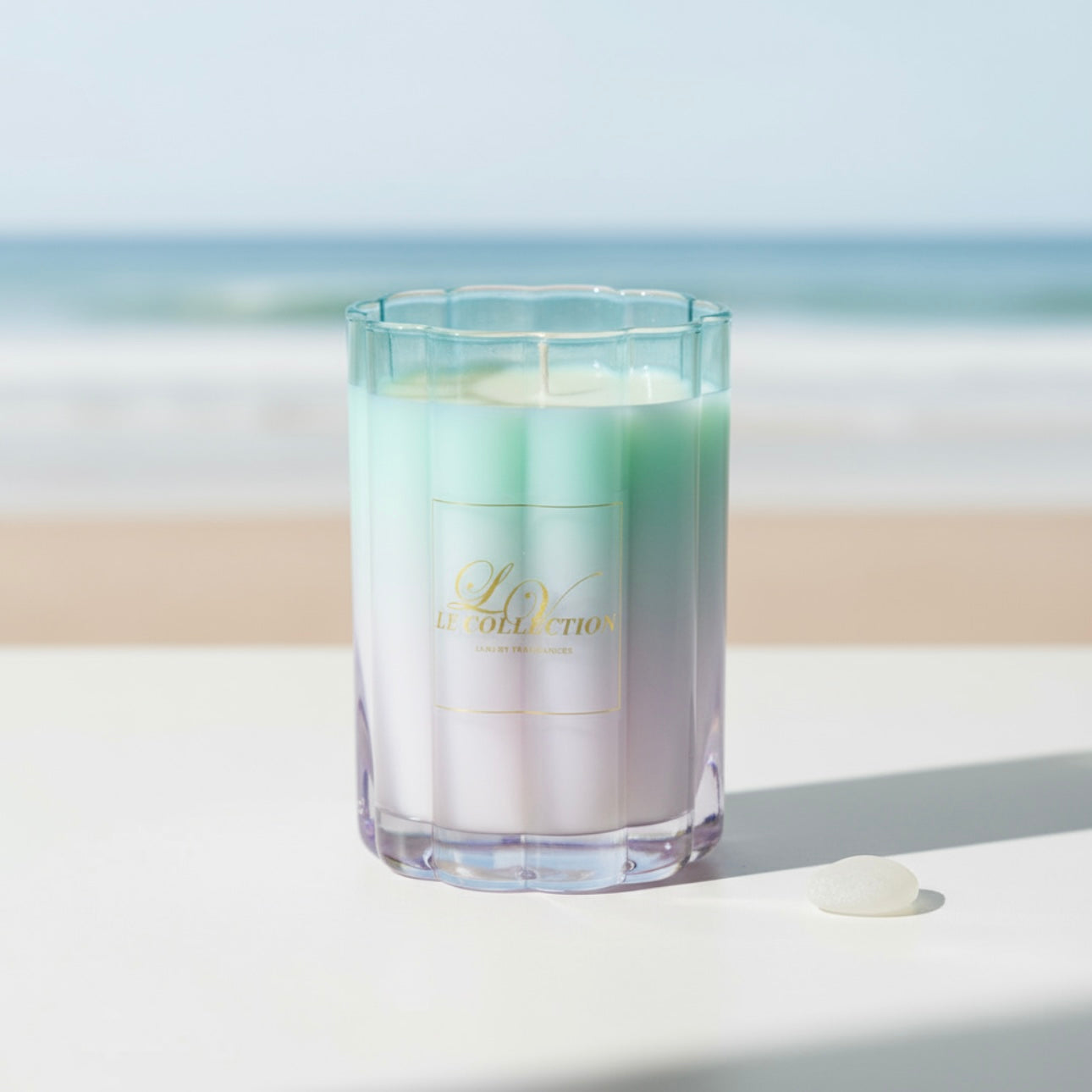 Transform your space into a coastal sanctuary with this elegant candle that brings the peaceful energy of the ocean into your home. The beautiful gradient design and textured glass create a captivating glow that enhances any room, making it perfect for relaxation, meditation, or simply enjoying a quiet moment.